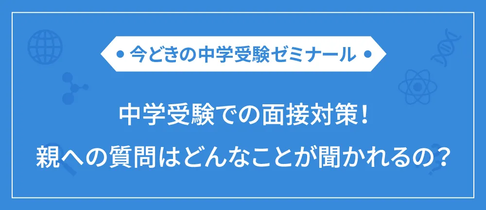 中学入試の面接試験で保護者の方に対してされる質問は以下のようなものです。お子さまへの質問と被る項目は、親子で食い違いが無いかを確認される項目でもあります。お子さまと保護者の方の答えの方向性に違いが無いか確認しておきましょう。