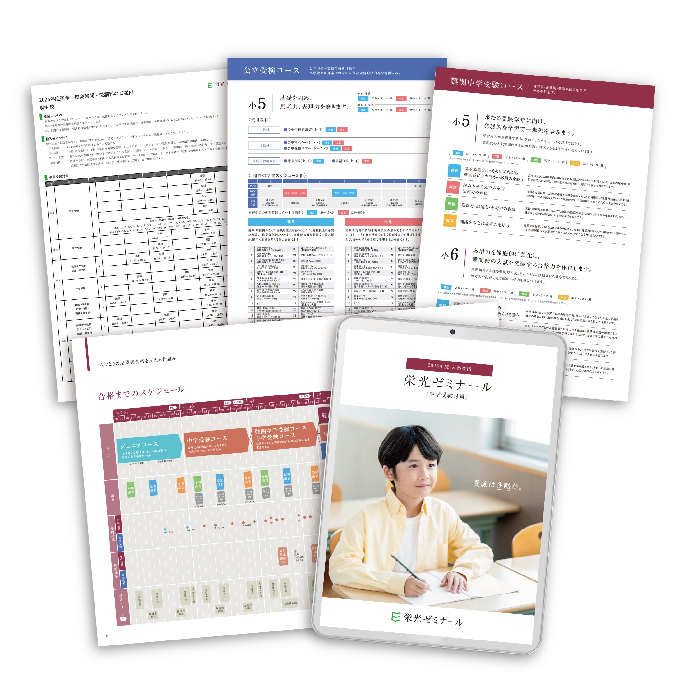 中学受験コースでは、中学受験専用のカリキュラムをご用意。小4までに基礎学力を固めます。小5・小6は、学習内容が高度になり、同じ内容でも一人ひとりの理解度に大きく差が出やすい時期です。栄光ゼミナールは1クラス10名程度の少人数クラスですので、教師が一人ひとりの理解度を把握しやすく、適切な発問や宿題の設定を行えます。家庭学習の進め方、志望校選びなど、受験のプロが合格まで全力でサポートします。