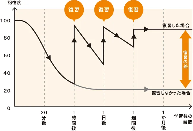 新しいことを覚えることに集中し、復習をしないまま一定時間経過すると知識は穴の開いたバケツの水のように流れ落ちてしまいます。翌日の学習を始める前に復習をすることにより、忘れていくスピードを低下させ記憶の定着率を上げることができます。そのためにも、"復習の回数"を増やすことを意識して、計画を作成しましょう。