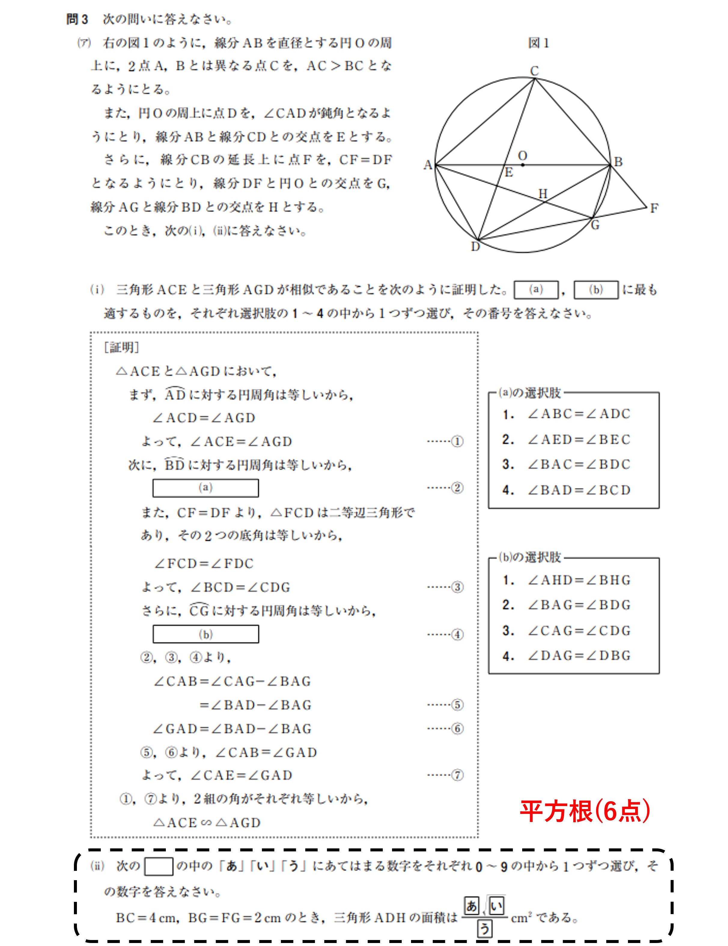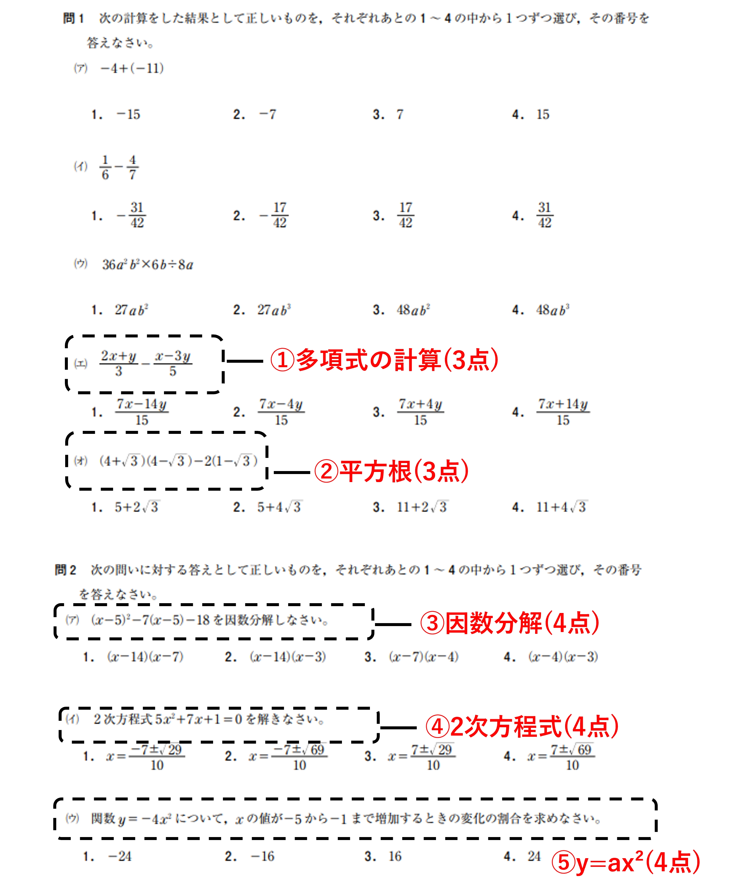 神奈川県では、毎年、問1と問2で計算問題等の小問が10問程度出題されます。ここに掲載したのはそのうちの8問。見てのとおり、そのうち5問が中3前半の「多項式の計算・展開・因数分解・平方根・2次方程式・関数y=ax²」で占められており、その前の問題も中1・2で習う計算です。これらの基本問題は、しっかり勉強すれば確実な得点源になります。この場合だと、最初の問題も含め27点分を獲得できることに。これは大きいですね。
