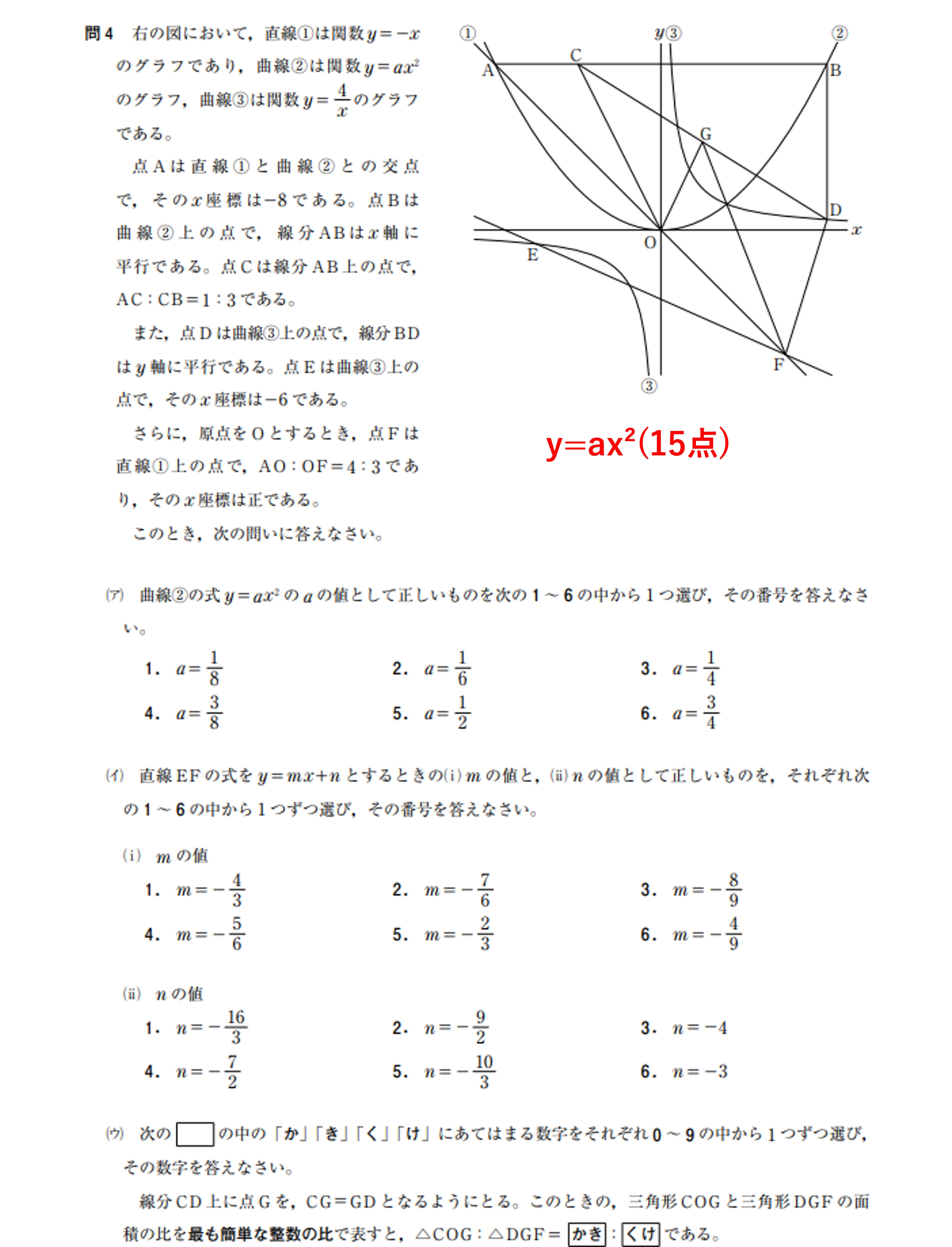 関数y=ax²が基本問題のほかに、独立した大問としても出題されています。問題がある程度パターン化しているので、大問の中でも完答できる可能性が高く、努力が成果につながりやすい単元です。