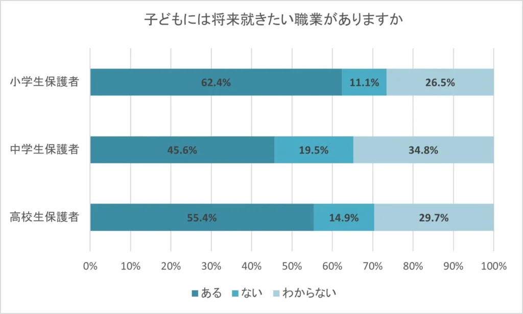 保護者に、子どもには将来就きたい職業があるか聞いたところ、小学生保護者の62.4%、中学生保護者の45.6%、高校生保護者の55.4%が「ある」と回答した。特に中学生保護者では、子どもに将来就きたい職業が「ない」、もしくは「わからない」と回答した割合が、小学生保護者・高校生保護者よりも高かった。