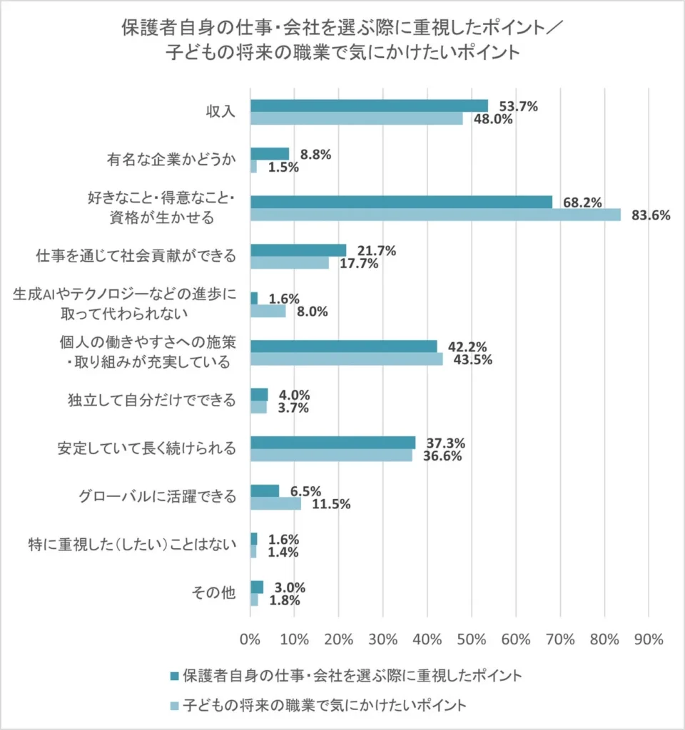 保護者自身の職業選択の際に重視した点と、子どもの将来の職業で気にかけたい点を比較すると、保護者自身の職業は「収入」「有名な企業かどうか」、子どもの将来の職業では「好きなこと・得意なこと・資格が生かせる」「生成AIやテクノロジーなどの進歩に取って代わられない」「グローバルに活躍できる」といった点をより重視していることが明らかになった。