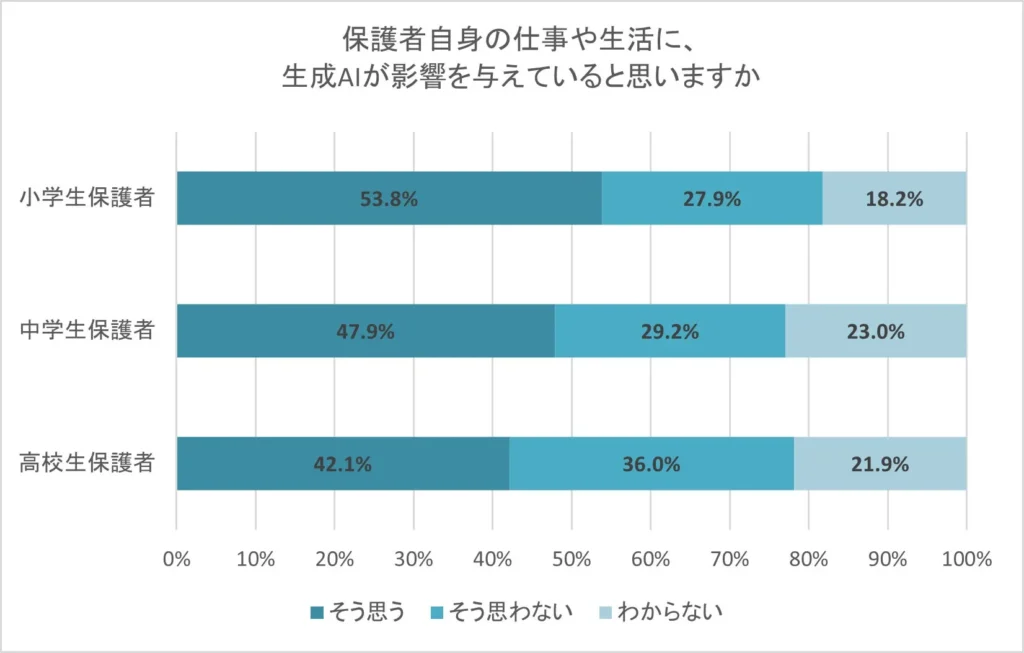 保護者自身の仕事や生活に、生成AIが影響を与えていると思うかという質問に対しては、小学生保護者の53.8%、中学生保護者の47.9%、高校生保護者の42.1%が「そう思う」と回答した。2024年に実施した調査では、小学生保護者・中学生保護者・高校生保護者のいずれも、「そう思う」と回答した割合よりも「そう思わない」と回答した割合が高かった。この1年で、生成AIがより身近になっていると考えられる。