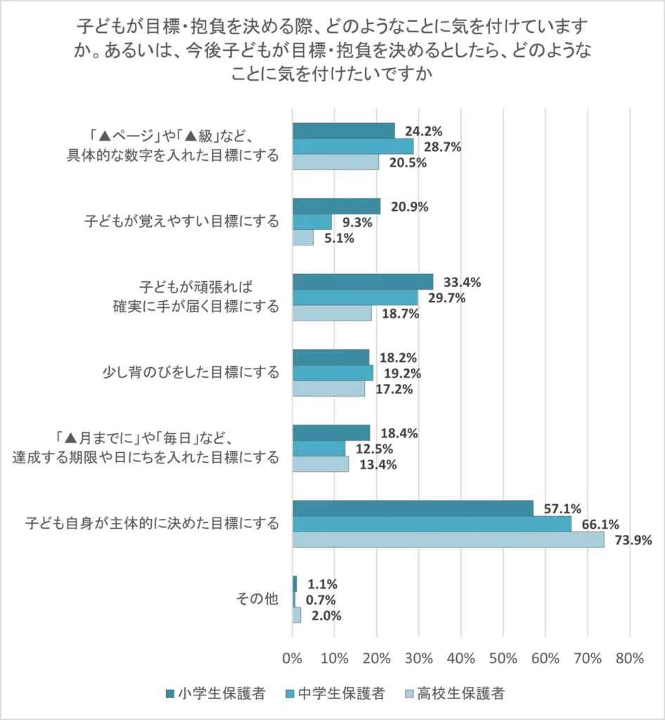 子どもが目標・抱負を決める際に気を付けていること、または今後気を付けたいことを保護者に聞いた。最も多かったのは、小学生保護者・中学生保護者・高校生保護者いずれも、「子ども自身が主体的に決めた目標にする」で、小学生保護者の57.1%、中学生保護者の66.1%、高校生保護者の73.9%だった。